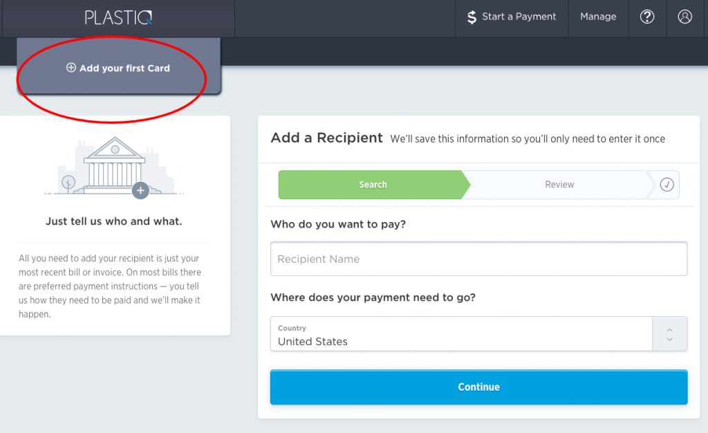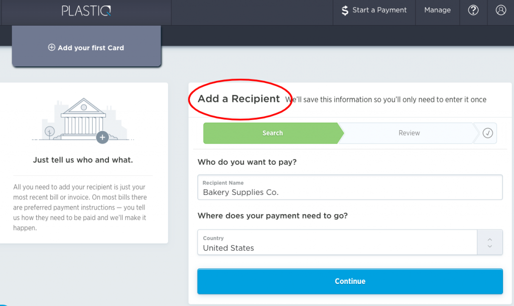 Next, you need to specify who you want to pay by clicking Add a Recipient in the center of the home dashboard. The recipient could be your landlord, a supplier, or your employees, for example. Remember, Plastiq will send payment to your recipients in the mode of their choice (physical check, wire transfer, or ACH bank transfer). You’ll need to provide enough information for Plastiq to facilitate the payment.